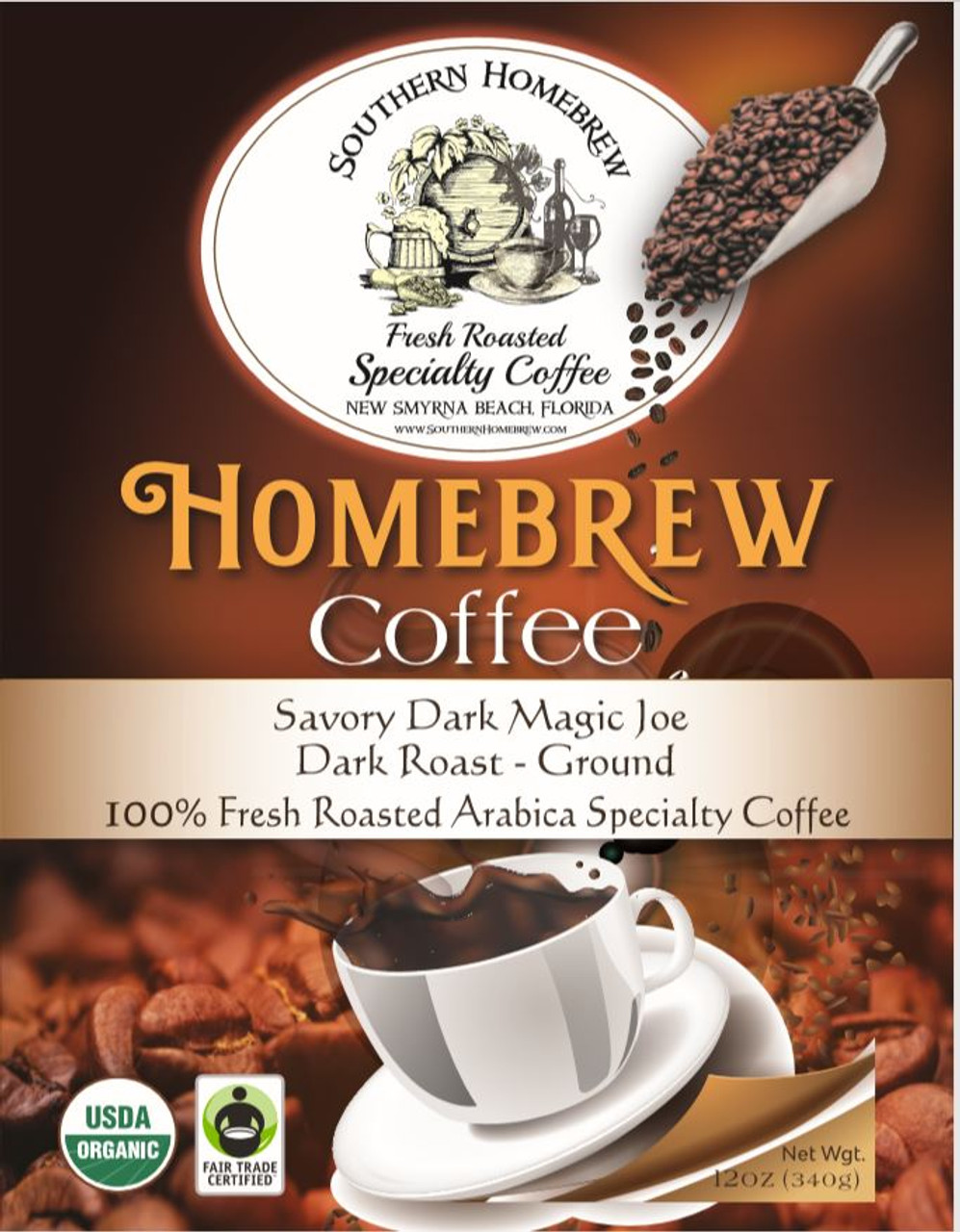 SAVORY DARK MAGIC JOE: Our signature secret blend! The subtle sweetness of the dark roasted South American bean accents the funky groove of the Indonesian. Sweet acidity is well balanced with the heavy body. 12 or 80 oz (5lb), Ground or Whole Bean Arabica Coffee, USDA Certified Organic Decaf Coffee, Fair Trade Certified, Gourmet Coffee from the Southern Homebrew Coffee Collection